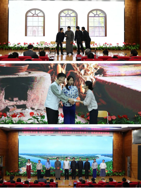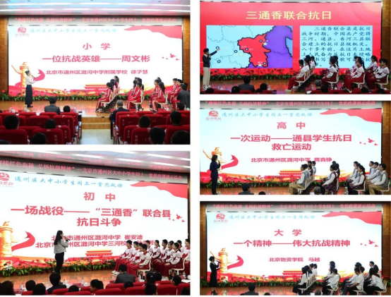 研究生与潞河中学学生联袂演绎了原创抗战话剧《运河烽火》,生动再现通州人民在抗战时期的英勇事迹,生动诠释信仰与奋斗的力量,让红色记忆在新时代焕发璀璨光芒。第二环节则为“青春诵华章:时代新人共抒报国志”,大中小学学生代表齐诵《少年中国说》,铿锵有力的诵读声响彻会场,展现了通州学子昂扬向上的精神风貌和矢志不渝的家国情怀。随后,大中小学四个学段的五位教师以“英雄·战役·运动·精神”为主线,以史为脉、以情育人,呈现了一场有温度、有深度的思政“金课”,展现了通州区思政教育一体化的深度融合与育人实效。潞河中学附属学校徐子慧老师以《一位抗战英雄——周文彬》为题,通过生动的讲述让革命先烈的形象跃然眼前;潞河中学崔安迪老师、潞河中学三河校区孙秀芳老师联袂呈现《一场战役——三通香联合县抗日斗争》,再现了那段可歌可泣的抗战历程;潞河中学蒋真铮老师以《一次运动——通县学生抗日救亡运动》为主题,展现了青年学子在民族危亡时的担当; 欧乐影院
